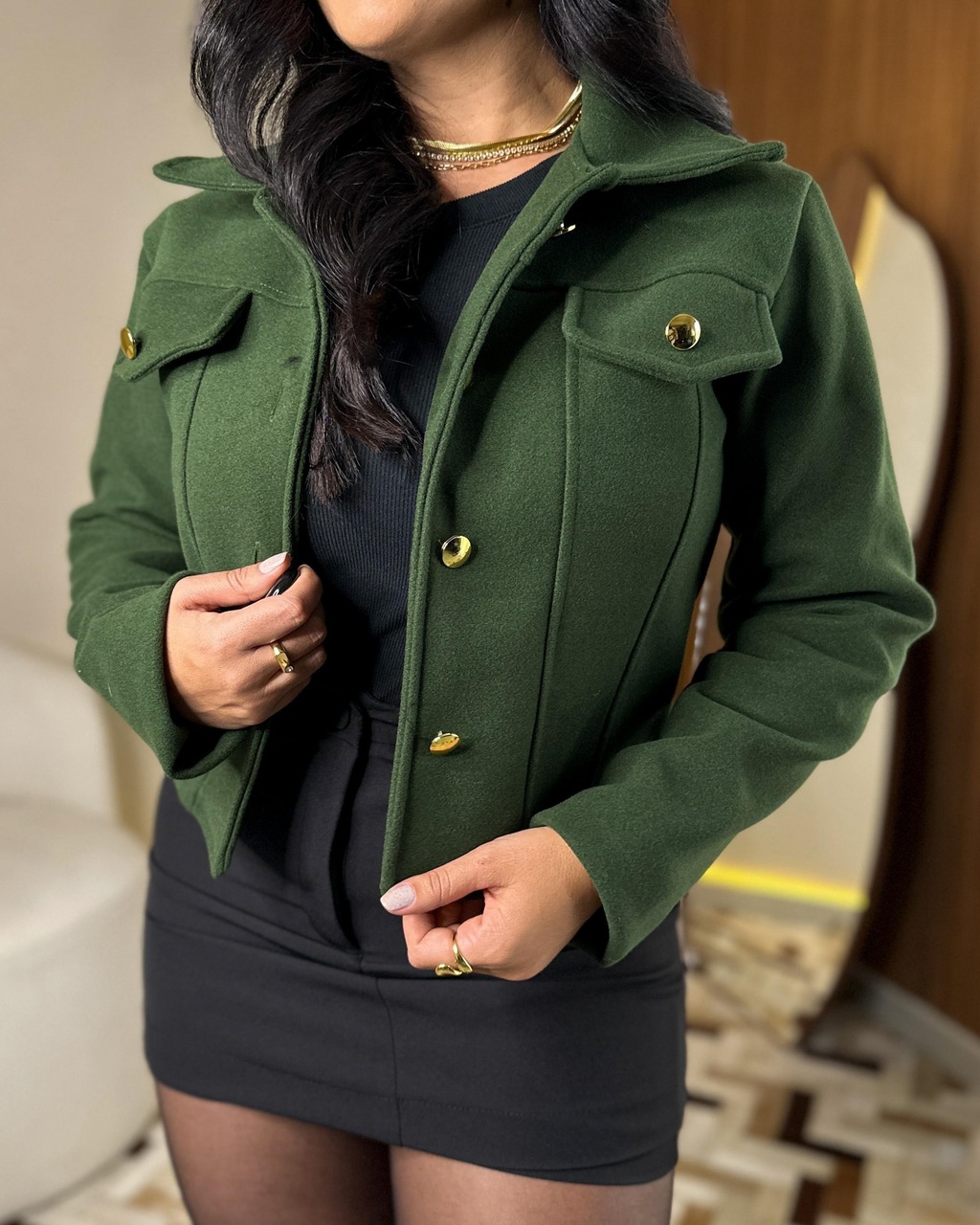 Estilo clássico e toque sofisticado: Esse casaco em lã batida acrílica é perfeito pra quem quer se manter quentinha com praticidade e estilo. O tecido é estruturado, com caimento impecável e o aconchego que os dias frios pedem.
