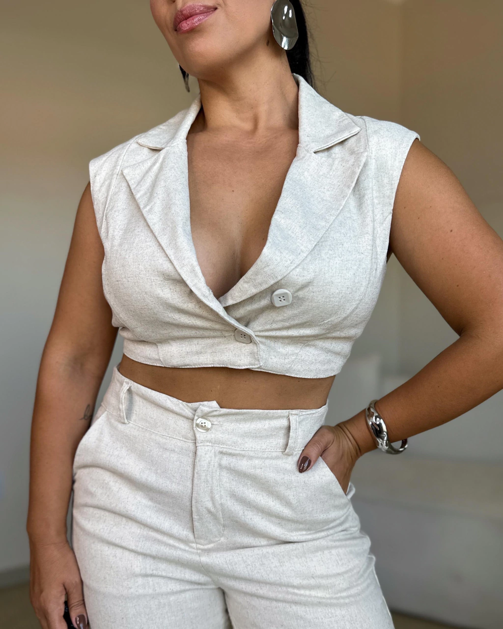 COLETE LINHO ELIZA: confeccionado em linho com elastano, comprimento curto, possui gola de lapela, fechamento com botões. Na parte traseira possui detalhe de costura deixando a peça bem ajustada ao corpo.