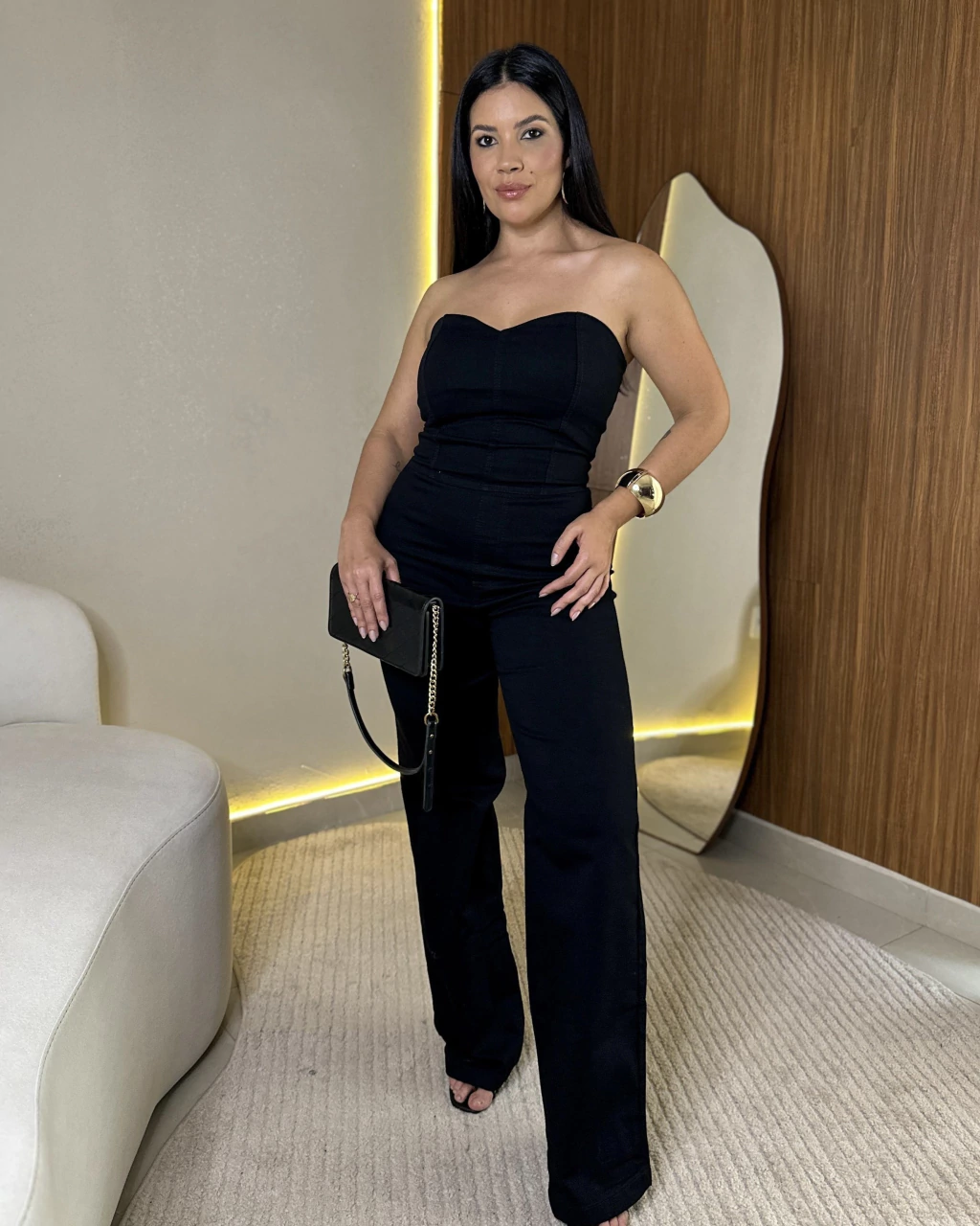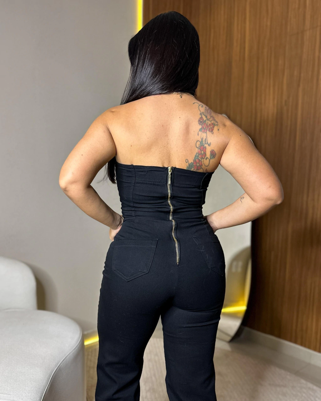 Macacão Jeans Roxy: O Macacão Roxy é a nossa peça mais vendida e não é por acaso.Confeccionado em jeans com elastano, ele une conforto e caimento impecável.Na parte de cima, a modelagem lembra um corset estruturado, valorizando a silhueta.Nas costas, o fechamento em zíper tratorado garante praticidade e ajuste seguro.A parte de baixo vem com modelagem flare, que alonga as pernas, e bolsos traseiros funcionais completam o design.