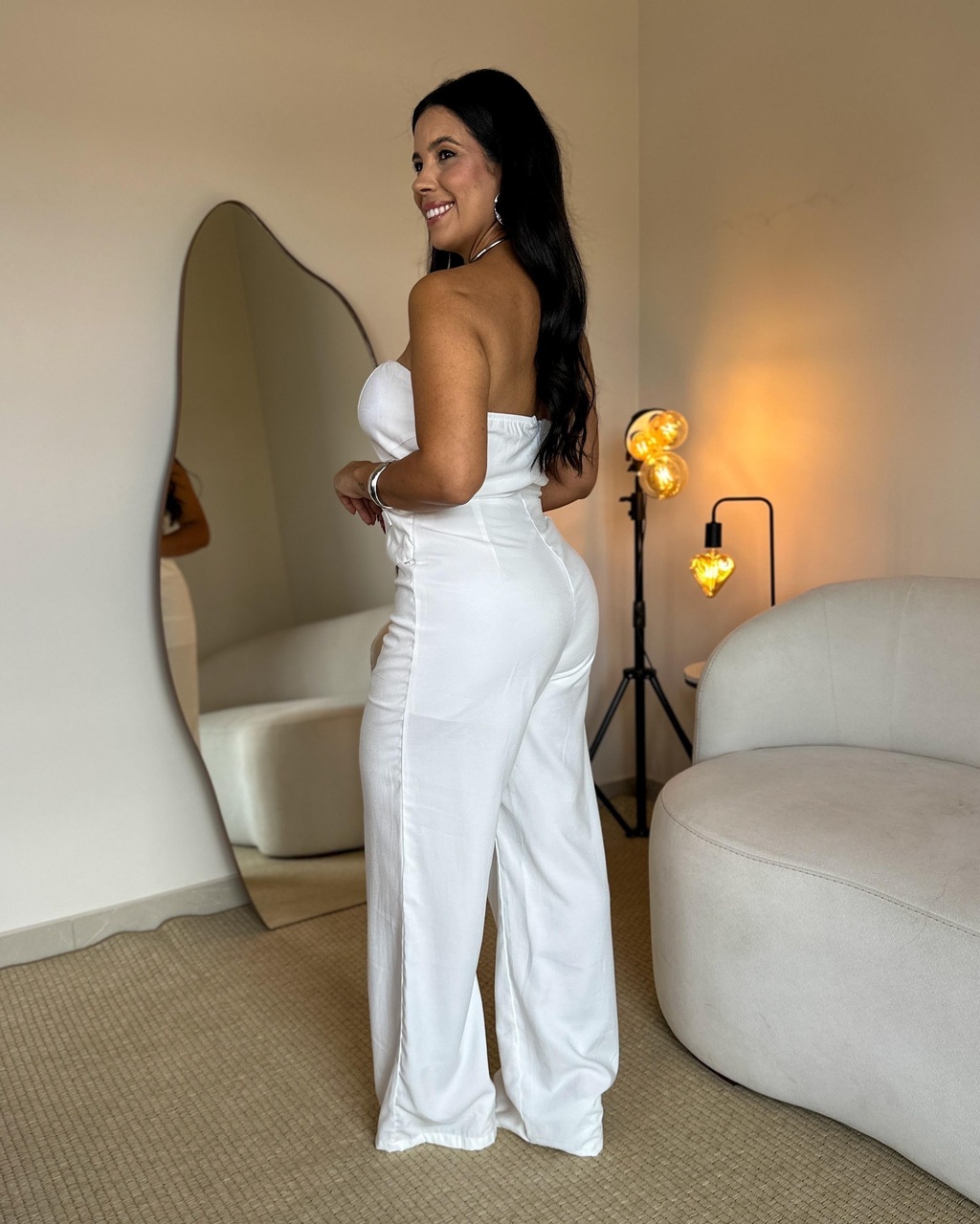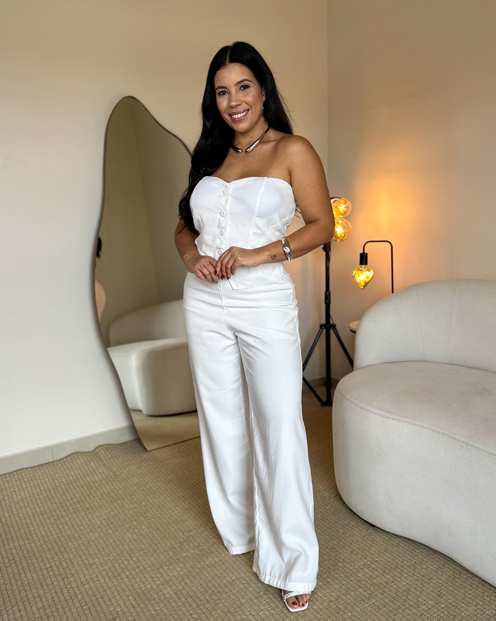 MACACÃO JORDÂNIA: Macacão modelagem alfaiataria, pantalona sem alças. Confeccionado no tecido marant, não possui elasticidade. Possui fechamento com botões funcionais na parte frontal, detalhe de bolso falso. Nas costas possui elástico, fazendo com que a peça vista perfeitamente ao corpo. Proporcionando conforto e segurança.